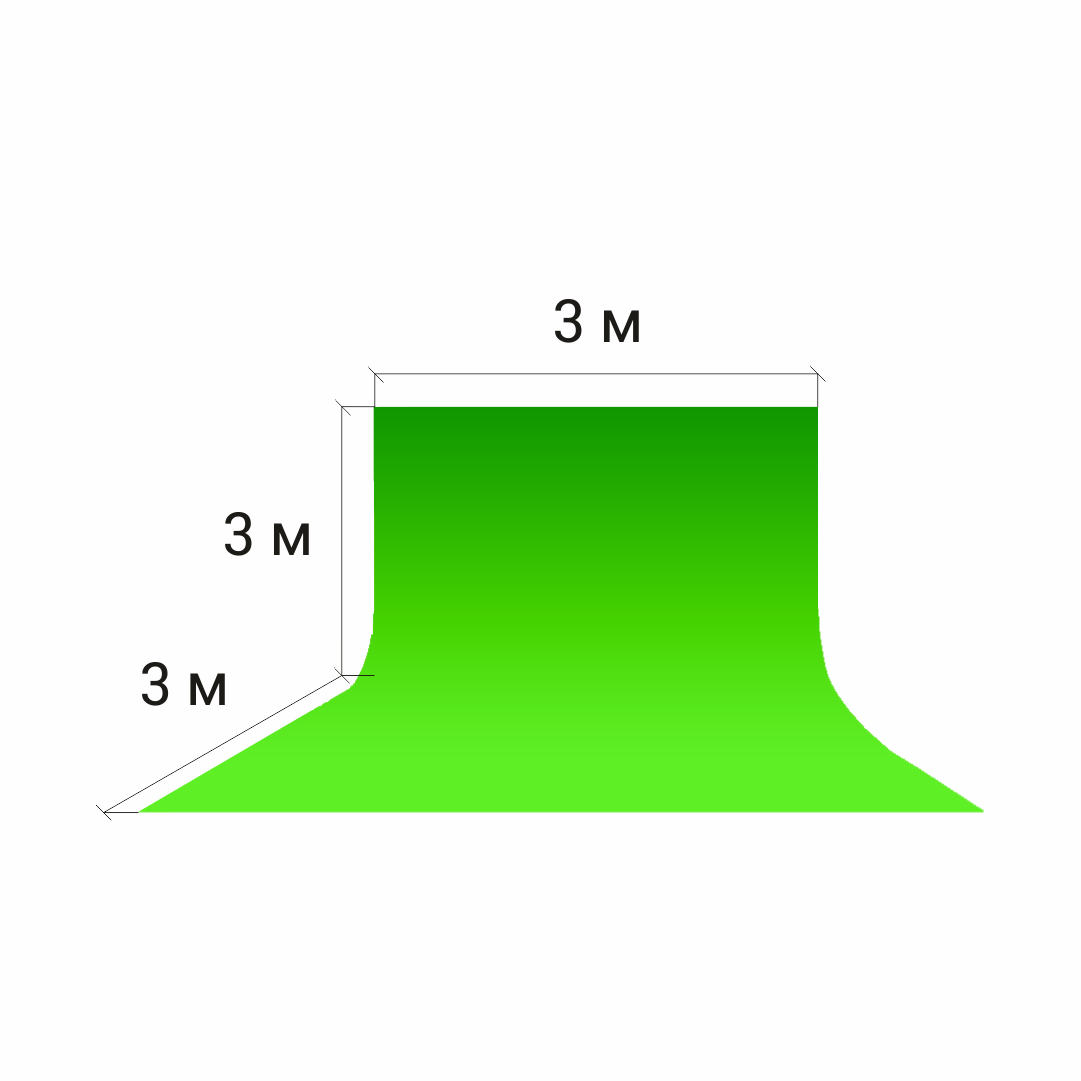 Размер циклорамы: 3 м / 3 м / 3 м. (высота 3 метра, ширина 3 метра, глубина 3 метра).